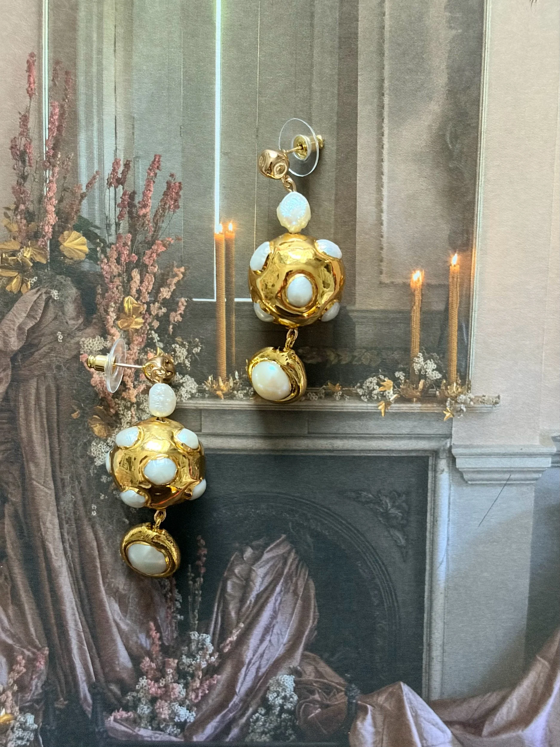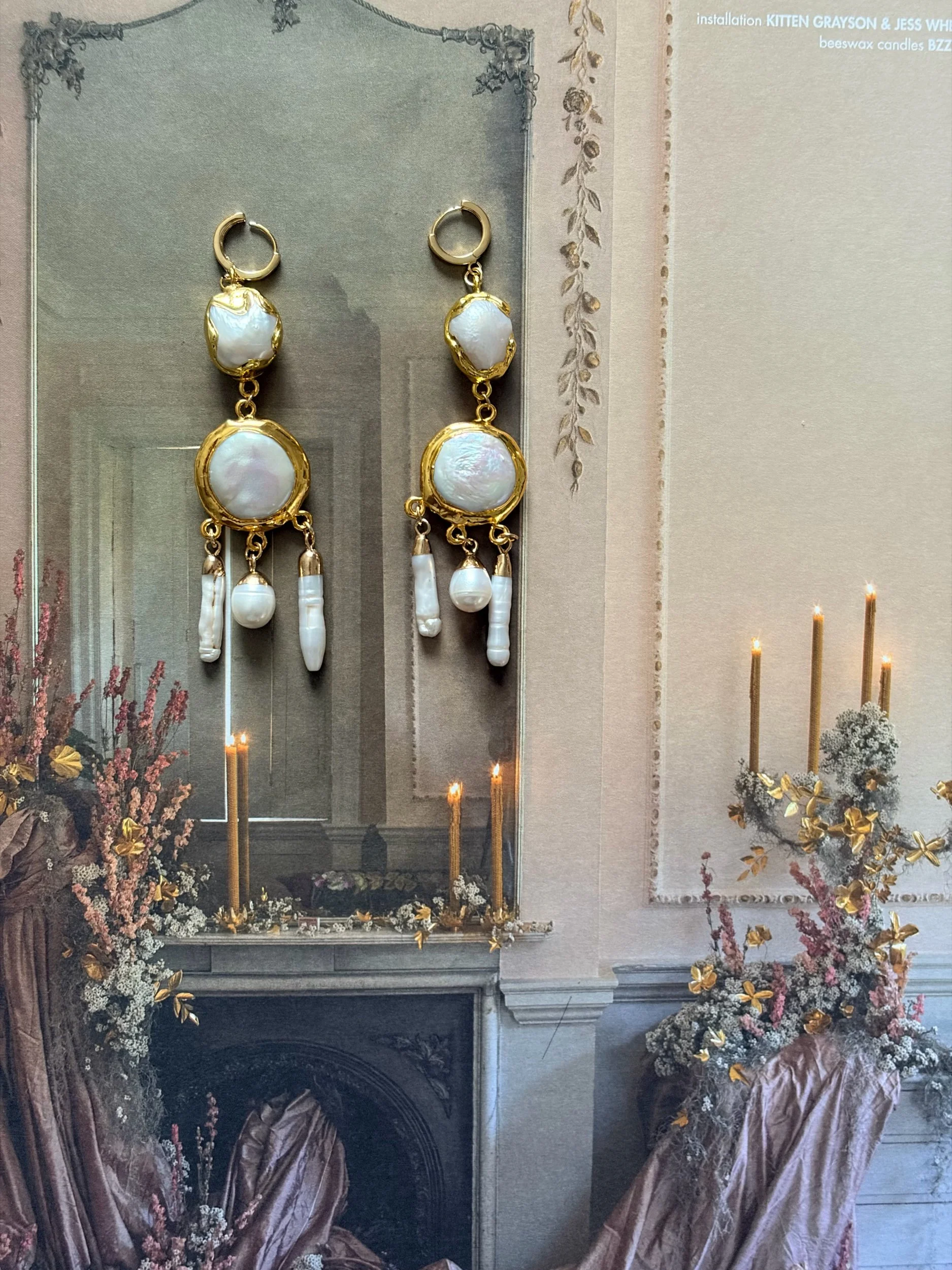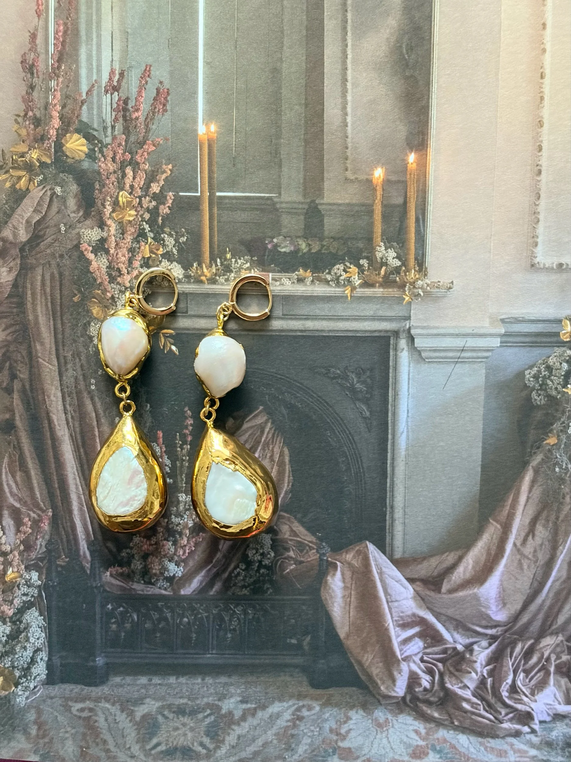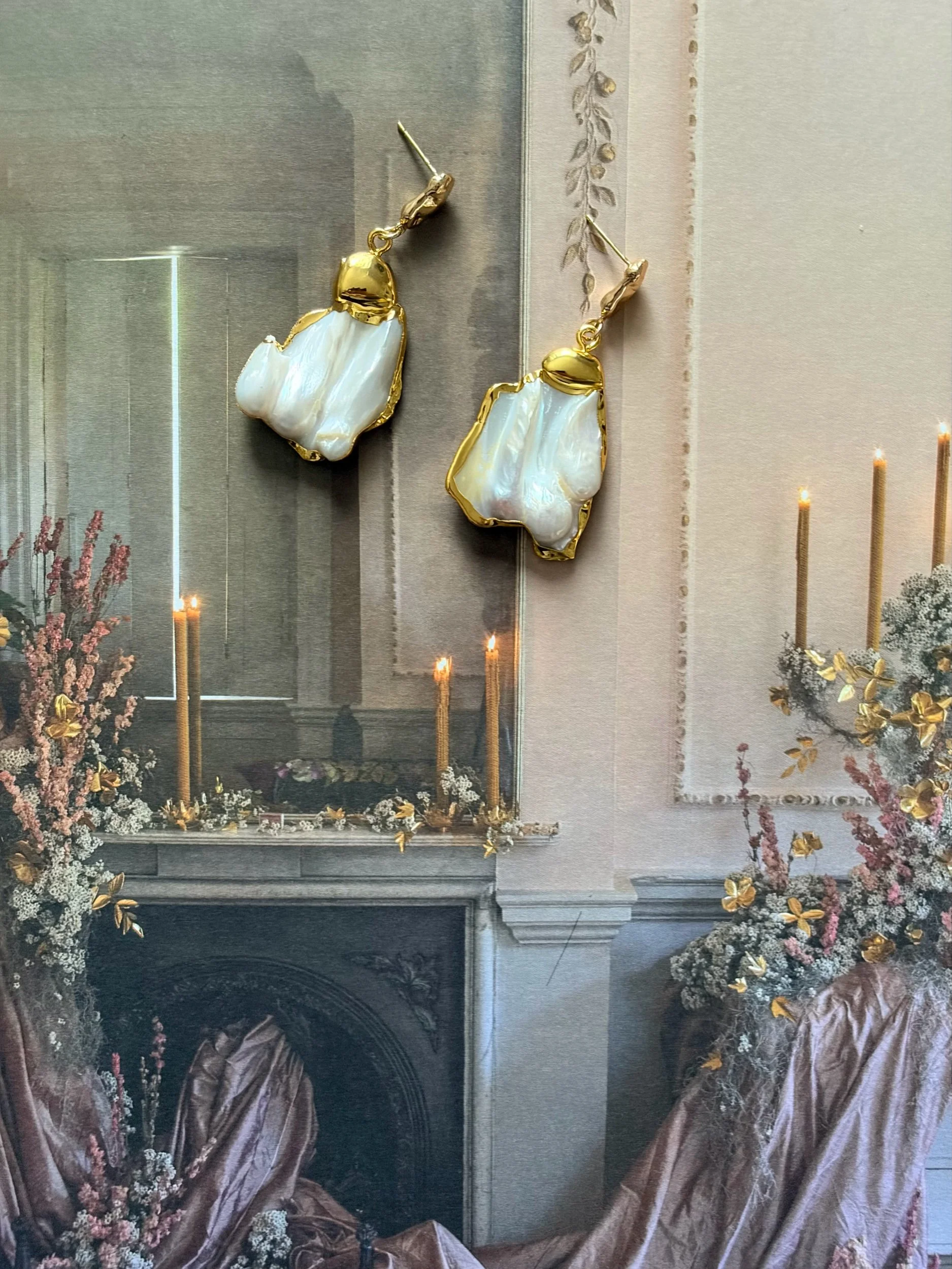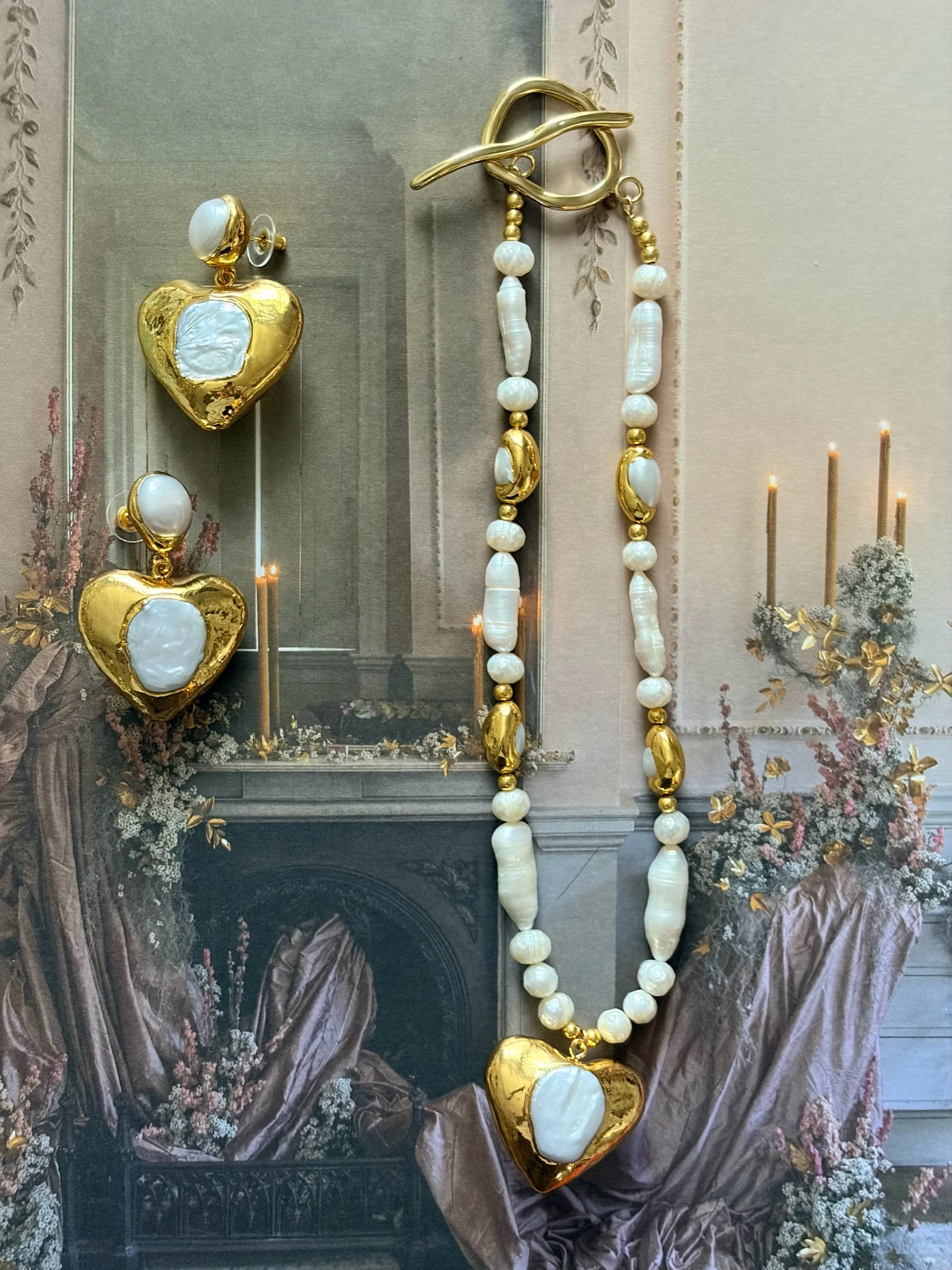 Each set is OOAK and uses raw and natural pearls - the metal component is 18K gold plated on copper. Please remove before showering and swimming and wait to wear till lotion and perfume have dried.