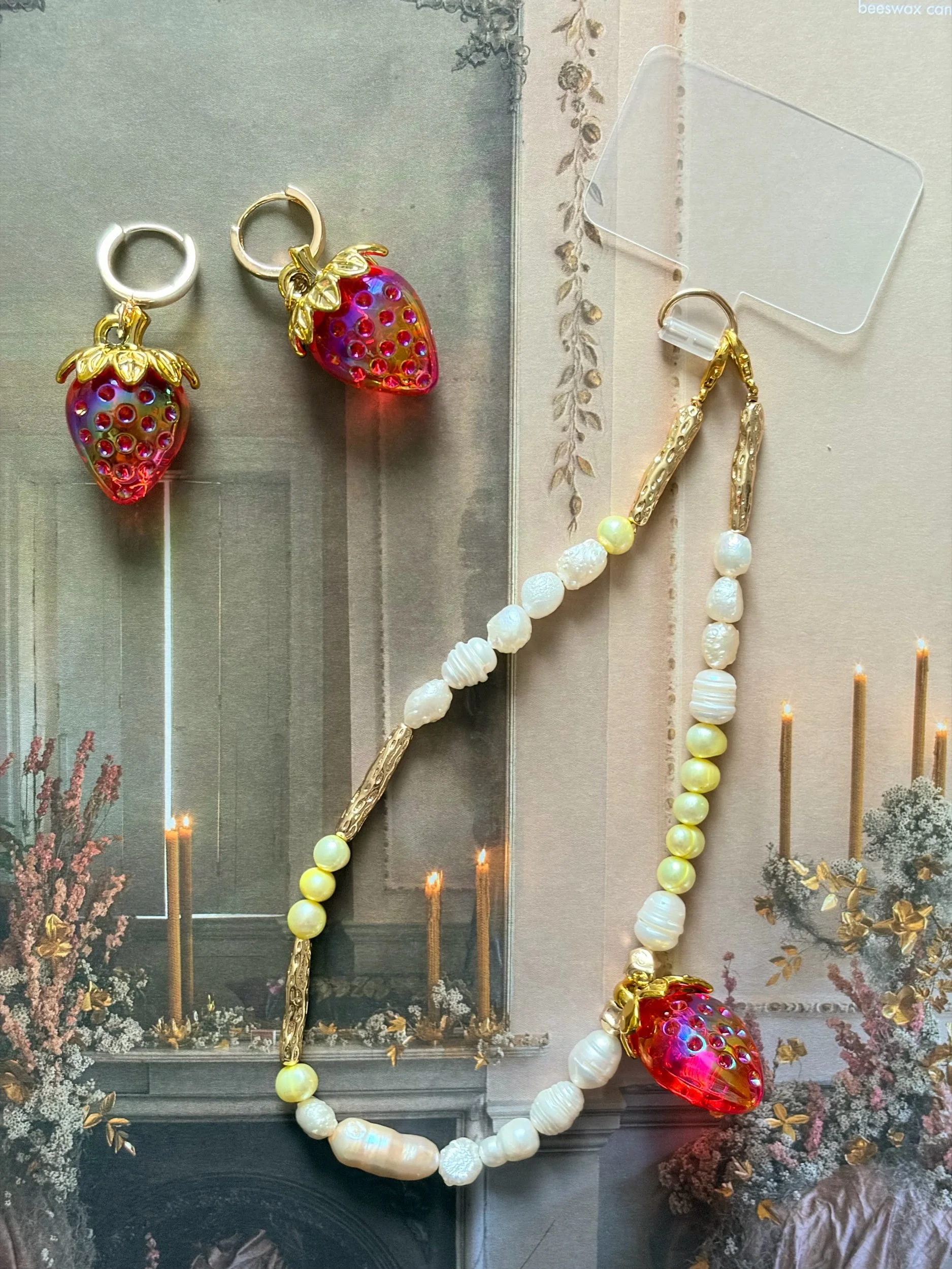 Pink earrings and phone chain is sold as a set - the strawberries are iridescent - the phone chain come with clear insert for phone and measures approximately `12 inches long